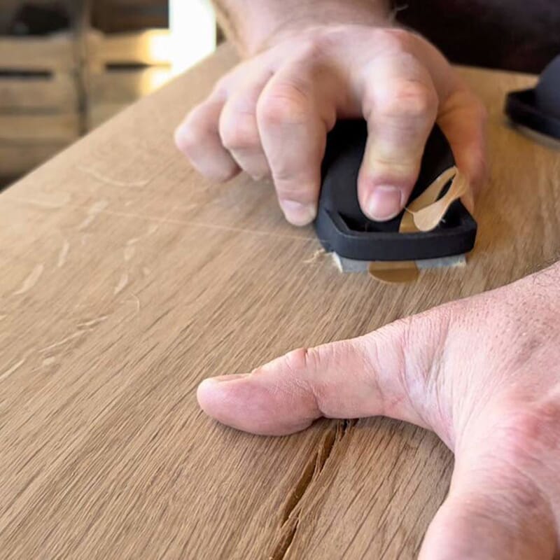 Skjære bort overskytende kvistfyller etter reparasjon av kvisthull, sprekker og andre skader i treverk.